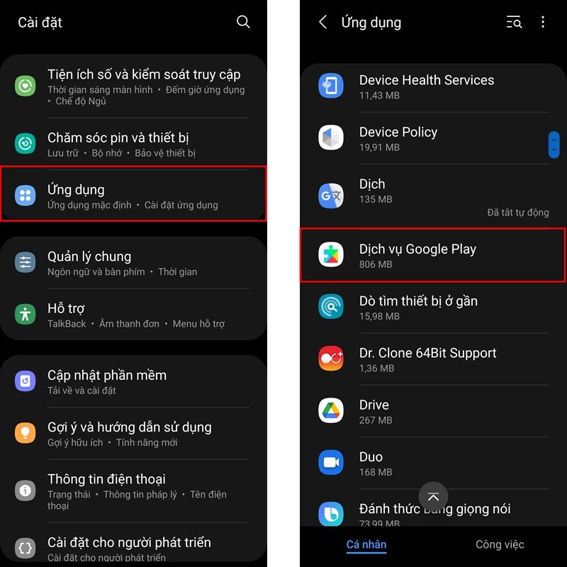 a) Vào Cài đặt > Chọn Ứng dụng> Dịch vụ Google Play: (Hoặc tương tự tìm từ khoá "Dịch vụ Google Play" để chọn)