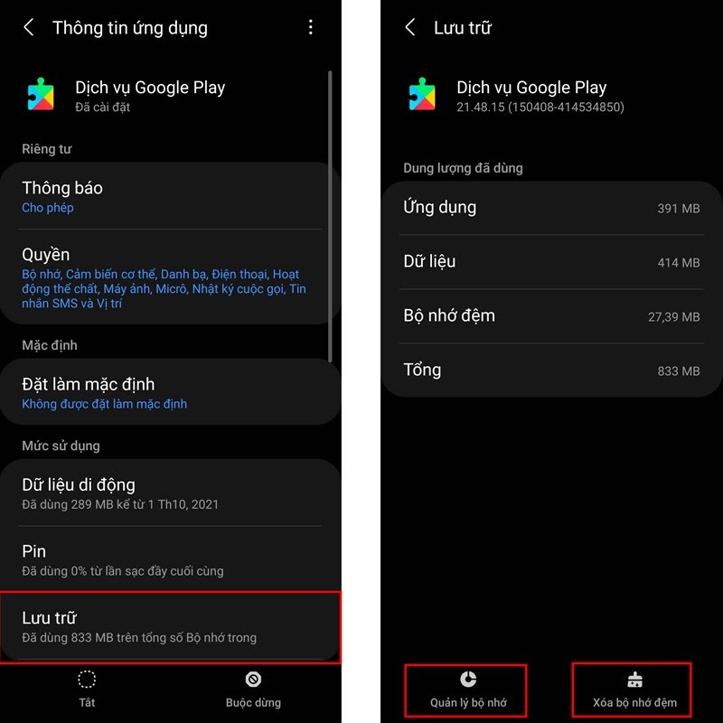 Tìm đến mục Dịch vụ Google Play > Lưu trữ > Xóa bộ nhớ đệm và dữ liệu nhé.
